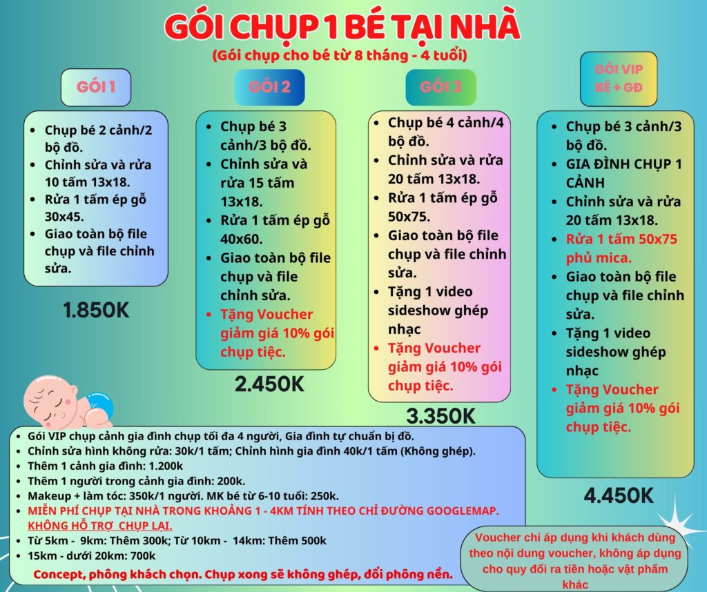 Xin gửi đến quý khách hàng bảng giá dịch vụ chụp ảnh thôi nôi tại nhà cho bé.